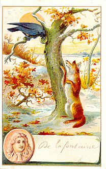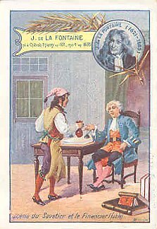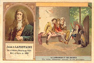 1920? One colored card with a portrait panel of La Fontaine on the left and a picture panel on the right of "Le Laboureur et ses Enfants," including a moral. An apparent advertising panel above is empty. The verso contains again La Fontaine's name and dates and a paragraph on his work. 27 Francs from Annick Tilly, Clignancourt, August, '01. Extra copy advertising "A la belle Jardinière" chicoree offered by C. Beriot, Lille, for €3 from François Magnin, Paris Post Card Exhibition, Jan., '05.