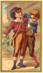The color work in this card is exceptional. Boudier claims awards 1867-1878. The image is a clear reference to the two mice or rats with an egg, but what is the chick doing in the picture? Advertising on the verso. No reference to La Fontaine or the fable. -