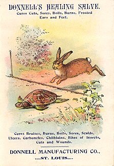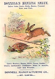A colorful scene of the finish line, approached by the hare while the tortoise is beyond it. Nothing on the reverse. The front promises: "Donnell's healing salve cures cuts, sores, boils, burns, frosted ears and feet. Cures bruises, burns, boils, sores, scalds, ulcers, carbuncles, chilblains, bites of insects, cuts and wounds." What does it not do? -