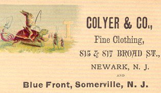 1900? One TH card advertising Colyer and Co. of Newark and Blue Front, Somerville, NJ, sellers of fine clothing. Just over 2" x 3½. From Lobo8 through eBay?
