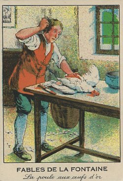 1930? Chromo trade card of GGE. "Fables de La Fontaine. La poule aux oeufs d'or." €4.50 from Helene Baumer, Epinay sur Seine, France, through Ebay, June, '20.