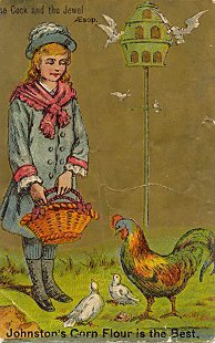 The golden background distinguishes this card, which has been cropped, bent, and is in only fair condition. The choice of a girl to complement the rooster in the illustration is surprising. What might she have to do with the fable's story? The text is in fact James' version verbatim, where no particular human being is mentioned. That version is unusual because it actually ends up contradicting the fable: "The Cock was a sensible Cock; but there are many silly people who despise what is precious only because they cannot understand it." The verso quotes Augustus Voelcker, chemist of the Royal Agricultural Society, on the value of corn flour. I have found a whole booklet of 24 images in this style. -