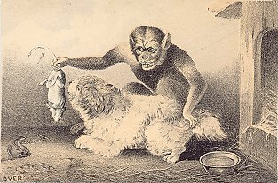 A monkey apparently holds a dog with one paw while presenting with the other a mouse right before the dog's nose. A small insert in the left lower corner says simply "OVER." The scene is similar to that on a Coat card, where the monkey dangles a fish before a cat. -