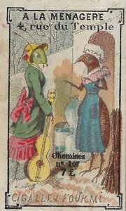 This illustration shows dressed insects, one fully outfitted for traveling and holding a guitar, the other in a homey apron. A la Ménagère is offering shirts for either 7 Francs (front) or 5 Francs (verso). The size of this little slip is remarkable, as is its detailed artistry. -