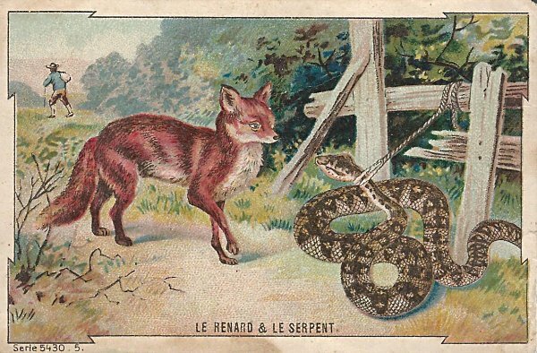 1915? One colored French card illustrating "The Fox, the Traveller, and the Snake" and advertising on its verso Chicorée Extra and Daniel Voelcker-Coumes. From Boulevard des Ecritures, St. Ouen, August, '15.