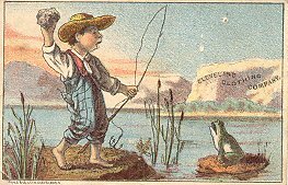 1920? Two colored cards advertising the Cleveland Clothing Company and picturing a boy about to throw a rock at a frog. $1 from an unknown source, with the extra copy in poor condition at the same time.