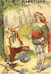 1890? One colored French card advertising "La Bonne Cafetière." Pictured is La Fontaine's "L'Avare qui a perdu son Tresor." Cropped to 3 7/8" x almost 2¾". 50 Francs from Annick Tilly at the Clignancourt flea market, August, '01.