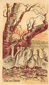 I doubt that this is really a fable card. It is a hidden-picture card, with a fox to be found by the clever observer. The back makes an offer "Mail us 10 for Comic Pictures, Mail us 25 for Beautiful Pictures." I take it this is one of the former, cheaper variety! Browns and reds. A small symbol at the lower right of the picture says "N 718." -