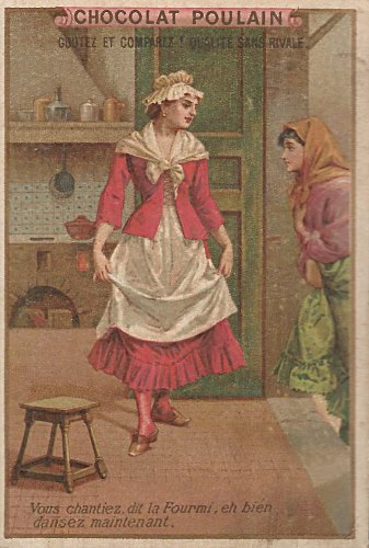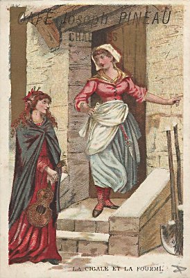 1910? One multi-colored card featuring two women as the dismissing ant and the dismissed grasshopper. Café Joseph Pineau, Chartres.