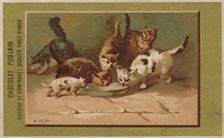 1910? One coloed card advertising Chocolat Poulain and showing an image of cats around milk. On the verso is Florian's fable "Ivy and Thyme." €5 in St. Ouen, June, '19.