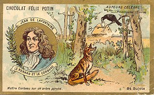 1920? One colored card with a circular portrait of La Fontaine on the left and a picture of FC on the right. "Auteurs Celebres" with 84 subjects announced on the picture side, along with the opening line of the fable. One copy adds "Chocolat Félix Potin" on the picture side and verso. It was printed by F. Champenois in Paris. The other copy adds nothing on the picture side but its verso is an advertisement for François Ledouarec, a grocer in Saint-Brieuc. Potin card for $5 from Dany Wolfs, Roeselare, Belgium, May, '01. Ledouarec card for $5 from Bertrand Cocq, Calonne-Ricouart, France, March, '01. Extra copy of the Potin/Champenois version for €3 from François Magnin, Paris Post Card Exhibition, Jan., '05.