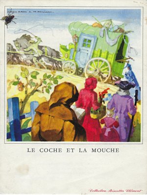 1960? Colored fable card advertising "Collection Biscottes Clément" and presenting "The Coach and the Fly" by Jean Mercier. $3.36 from Jeannick Brisson, Baignes Sainte Radegonde, France, through Ebay, May, '20.