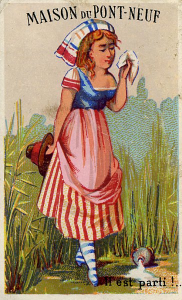 1900? One colored French card presenting a scene from MM and advertising "Maison du Pont-Neuf." 1¾" x 2¾". St. Ouen, August, '15.