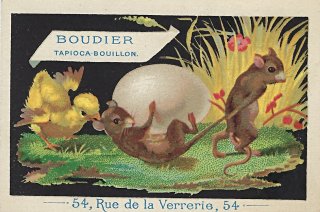 1890? One colored small card (2½" x 3¾") advertising Boudier "Pates Alimentaires" and showing two mice with an egg. €5 in St. Ouen, June, '19.
