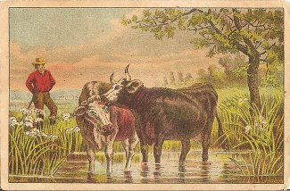 1910? One multi-colored card featuring a cow and a bull in a swamp with a farmer watching them. 3⅜" x 5⅛". $4 from Philip Demke, Plainfield, VT, through eBay, Oct., '08.