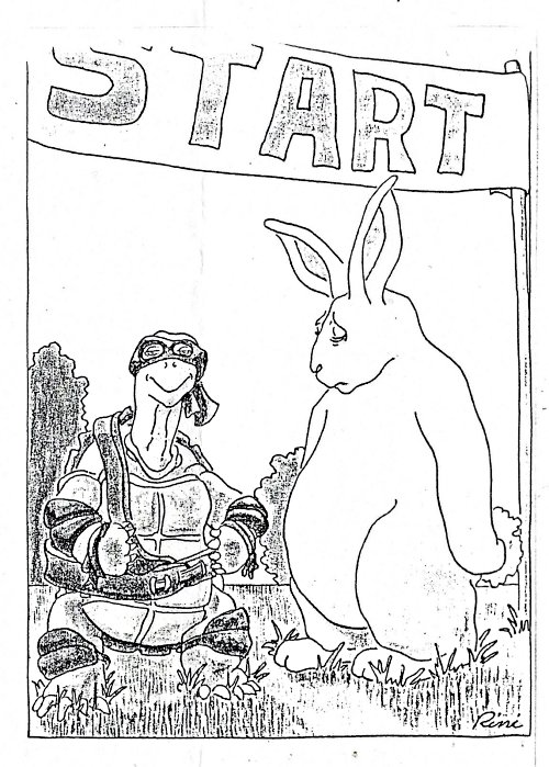 By contrast with a New Yorker cover a year later, this tortoise is a Ninja! And it takes the poor hare completely by surprise. Since he is a Ninja, he appears to be supremely confident. Sometimes there is a reason why fables turn out in the their own surprising fashion! - Date