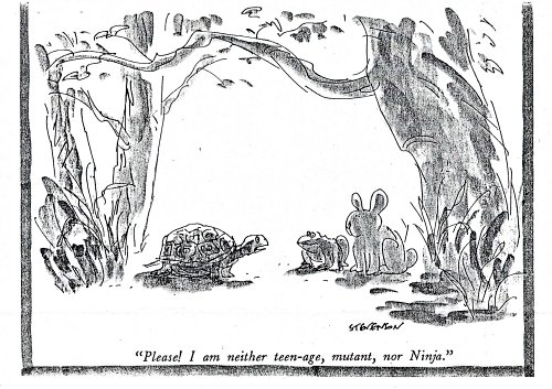 Popular culture became so fascinated by teen-age Ninja mutant turtles that Stevenson suggests the old fable and has the turtle disclaiming that default modifier for any turtle. - Date