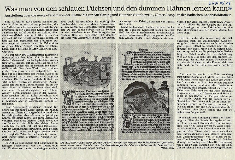 1996 Badische Neueste Nachrichten Article on Ulm Fable Exhibit in Badische Landesbibliiothek: “Was man von den schlauen Füchsen d den dummen Hähnen lernen kann.” Sept. 5, ’96.
