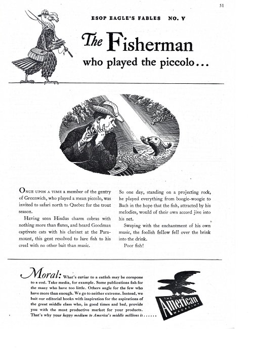 1944 Advertisement for “The American Magazine”: “The Fisherman who played the piccolo…” Esop Eagle’s Fables No. V. New Yorker, May 13, 1944. $9.99 from The Ad Store, April, ‘09.