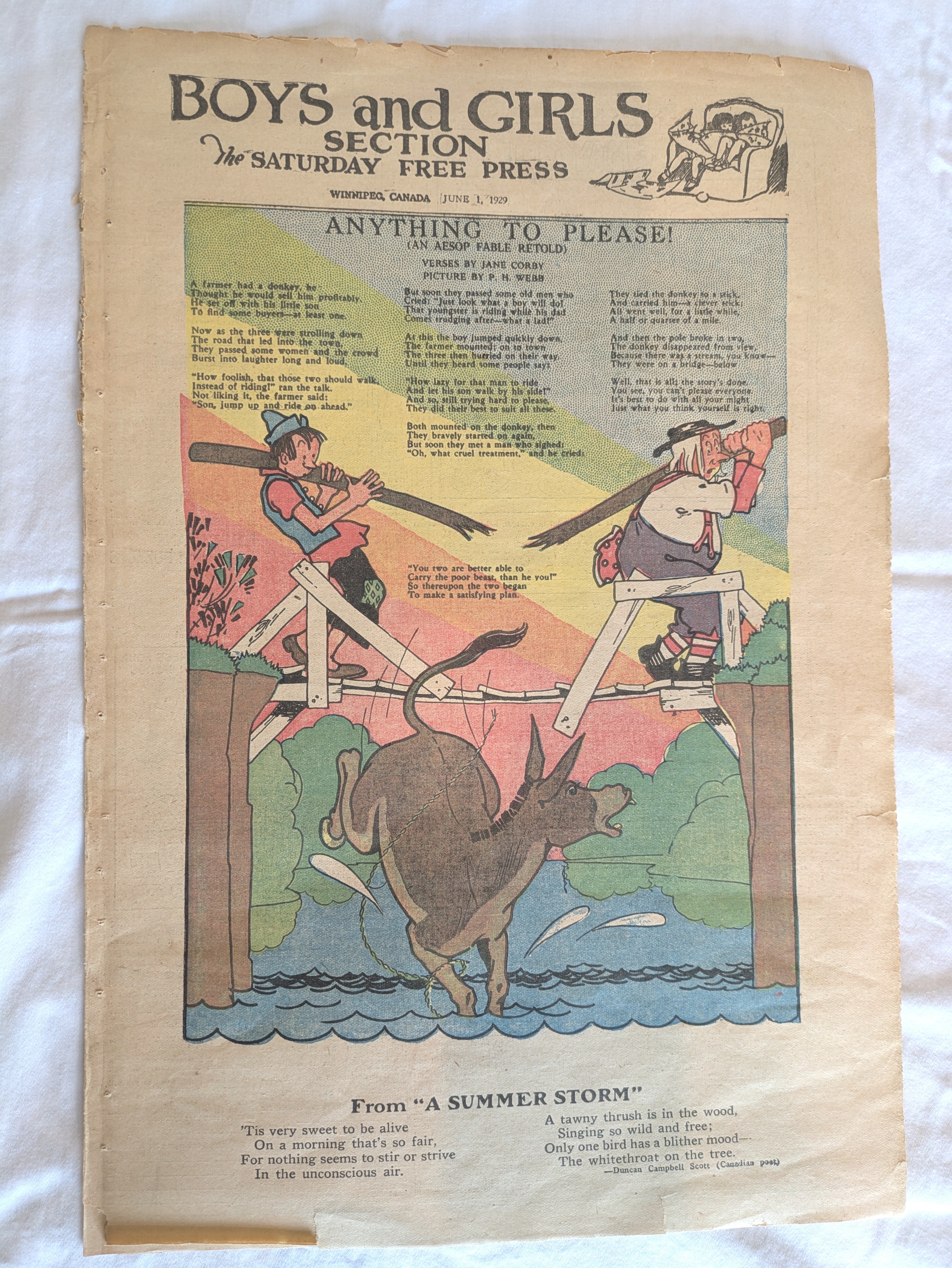 1929 “Anything to Please! (An Aesop Fable Retold)”. Verses by Jane Corby. Picture by P.H. Webb. Boys and Girls Section, “Saturday Free Press,” Winnipeg Canada, June 1, 1929. Unknown source.