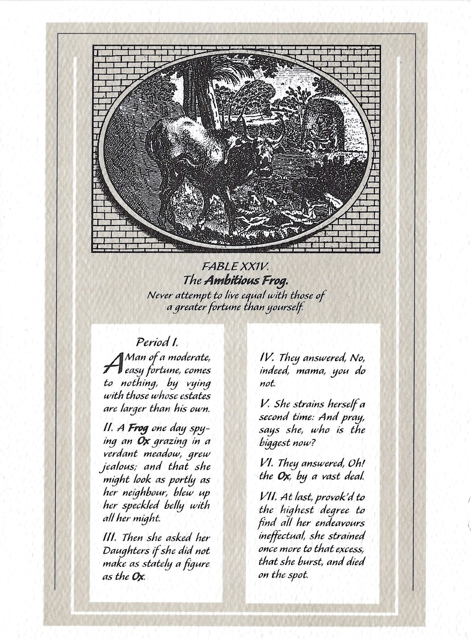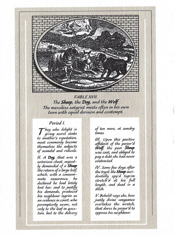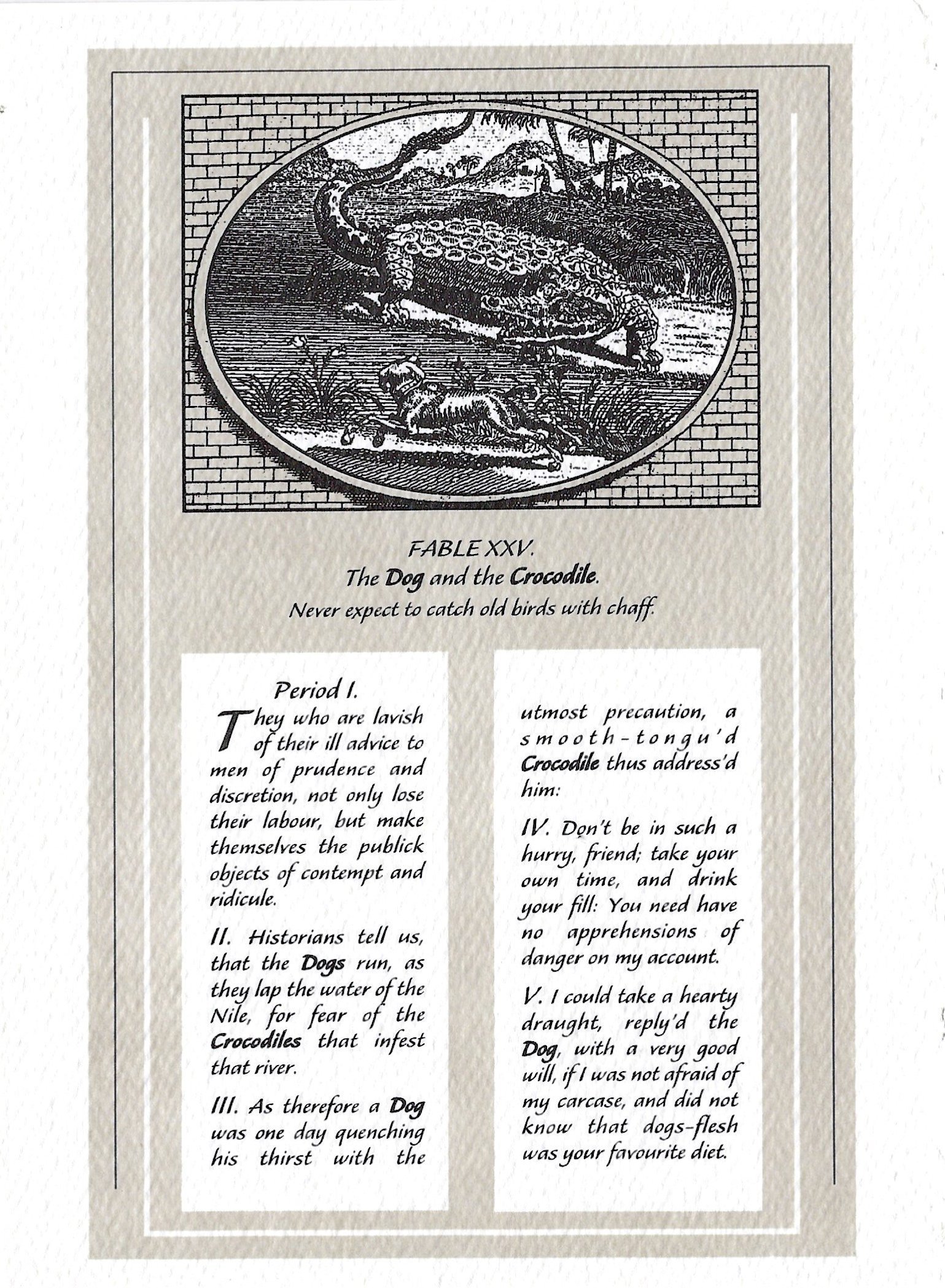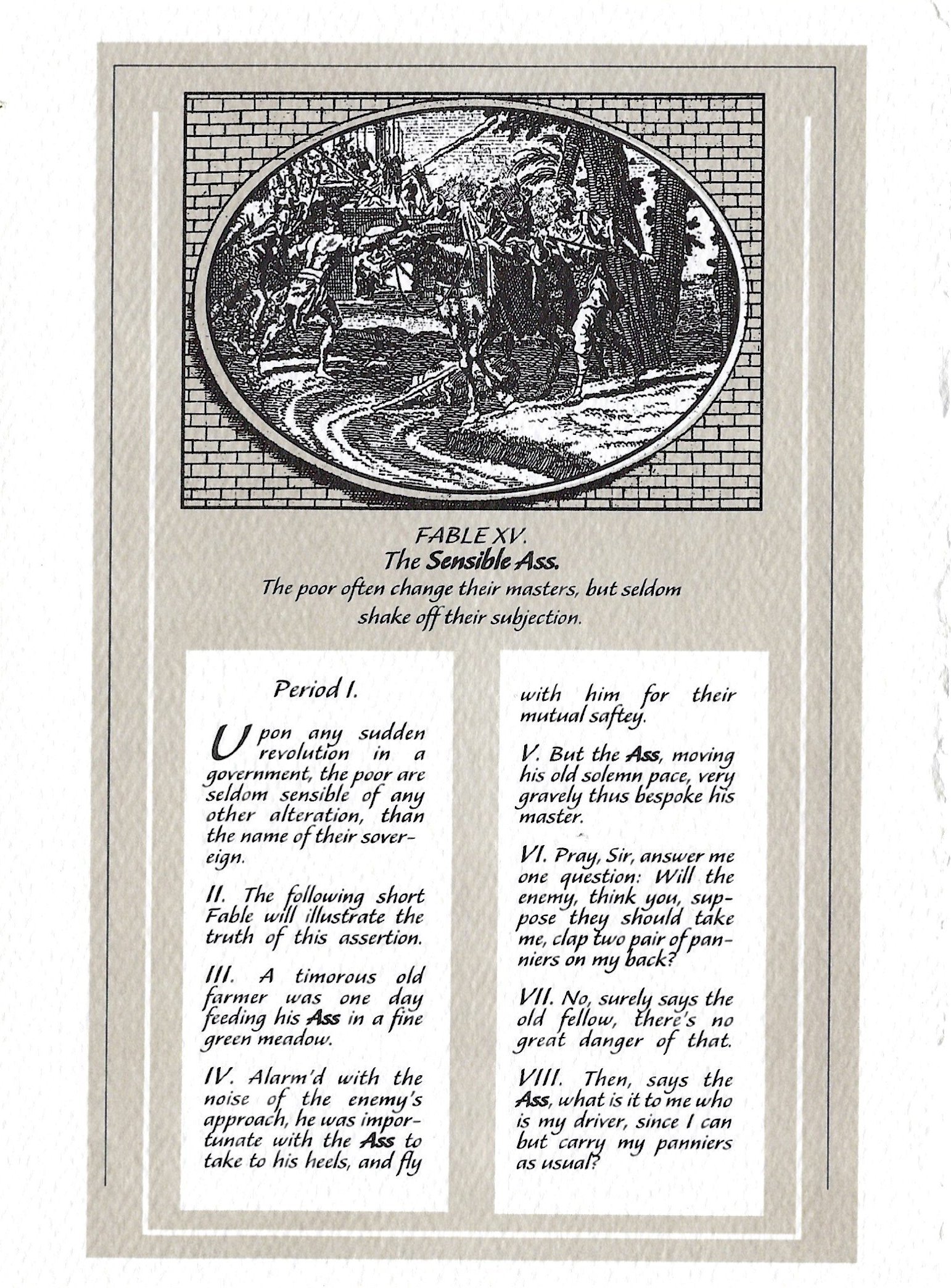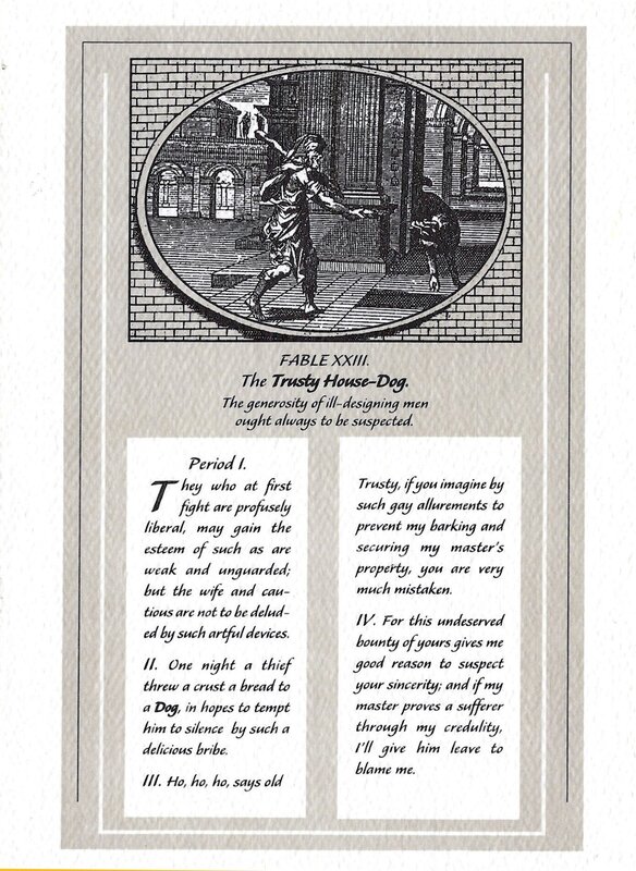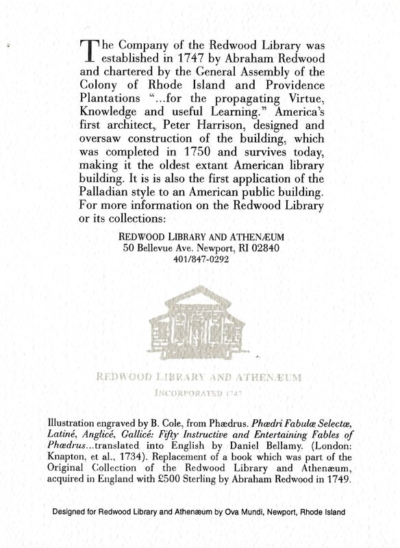 2017 12 Notecards by Redwood Library and Athenaeum Presenting Images and Texts from Phaedrus. Illustrations engraved by B. Cole from 1734 “Phaedri Fabulae Selectae, Latine, Anglice, Gallice.” Newport, RI. Unknown source.
