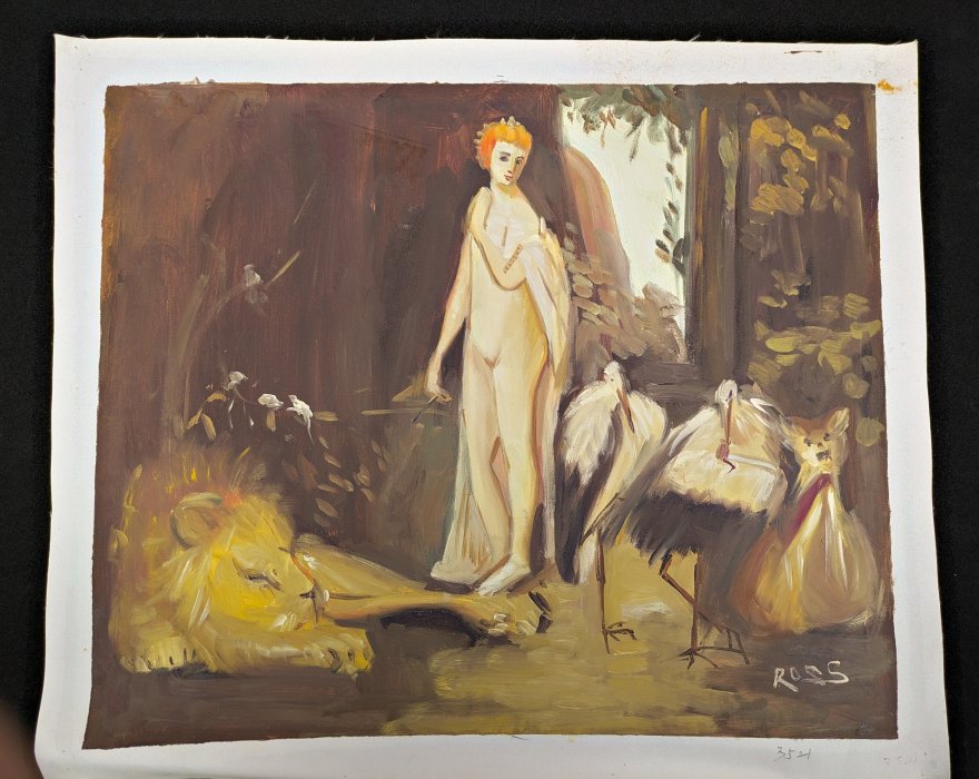 I show also an image of Klimt's original. As I mention of our photograph of Klimt's painting, starting from the right, we find here FS; FK; perhaps “Heron”; perhaps “Lion in Love”; and perhaps TMCM. There may well be other fables hidden in the painting. The fox's vase and the two mice not come out as clearly in Ross' more impressionistic handling of the scene. Is the "Ross" here Bob Ross, the well known painter? - Date