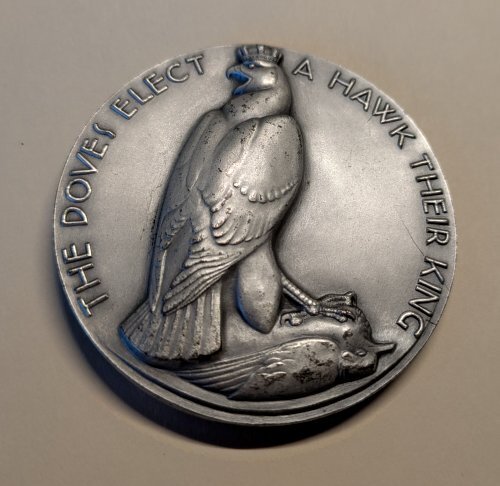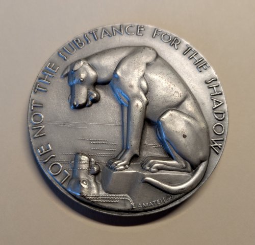 This double-sided medallion is both large (2.6” in diameter) and heavy. The seller notes that Amateis selected these fables for "their enduring timeliness and left the interpretation up to the beholder, as best suits his sociological, political, or economic inclinations." For me, both faces reveal a great deal in their lowest segment: the reflection in DS and the pinned dove under the regal hawk. - Date