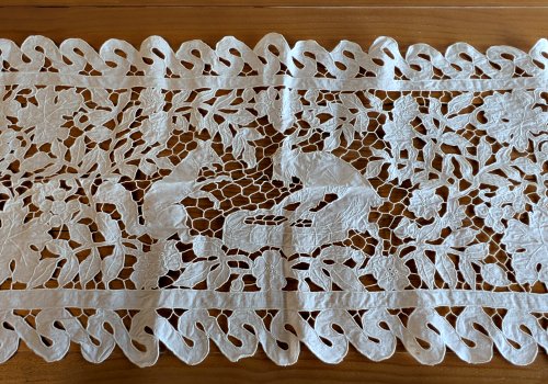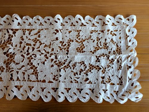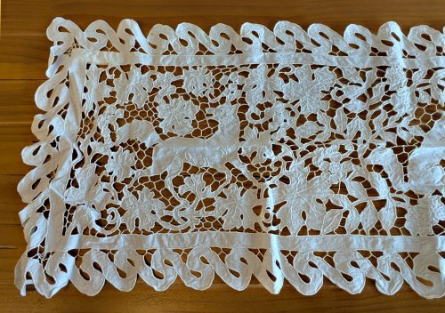 1950? Antique white needle lace table runner, possibly a Point de Venise style. “Fox and Goat” and perhaps FG? 56” x 16”. Unknown source.
