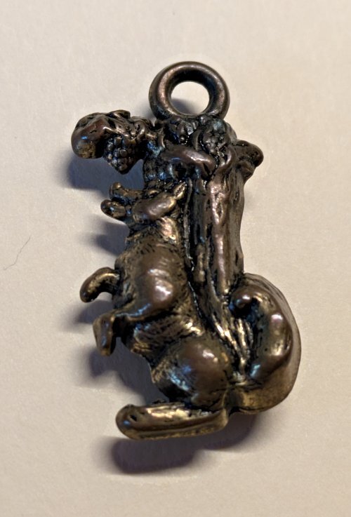 This looks like a cracker jack “toy” or gumball vending prize. Unfortunately, the web offers no help on finding a series to which this might belong. The name on one face tends to obliterate the scene. The other face helps us to see the fox and the grapes. Since the inscription is written at 90 degrees from the scene itself, I offer three different views. - Date