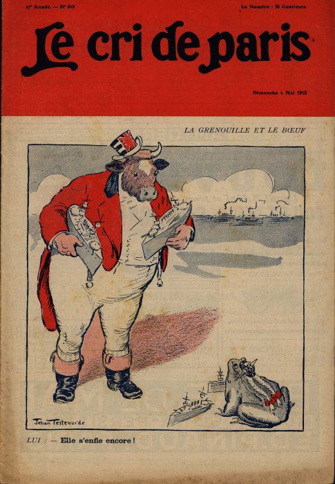 England holding its ships looks at the little frog and finds him blowing himself up with ships. Is England even giving ships to the frog? Is that the famed British fleet in the background? A little online research suggests that Testevuide did several covers for "Le Cri de Paris." - Source
