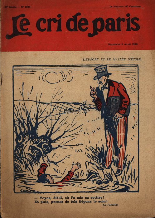 1922 "L'Europe et le Maitre d'École." Uncle Sam as the Pedant lectures the drowning child that is Europe, quoting La Fontaine. Front cover. Le Cri de Paris No. 1305, April 2, 1922. 8¼" x 11¾". €10 at Clignancourt, July, '19.