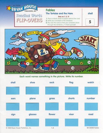 I had not known of the existence of this learning tool. Each of the four stiff pages has a full-color cartoon image of its fable in the upper half with fifteen numbered items. The lower half of the page consists of the names of these fifteen items with an open rectangle beneath each name for the insertion of the correct number. When the page is flipped over, the young reader can check her or his numbers against the correct numbers below each word. Sentences at the top of this page use some of the emphasized words. - Source