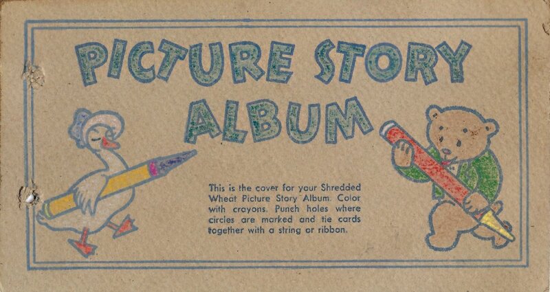 - 1935? Shredded Wheat Picture Story Album. Twelve 3" x 7" cards of familiar rhymes, stories, and foreign places, several colored in. $.25 at the Omaha Antique Center, Winter, '89. Included is TH. Also, though without fables, an incomplete set of Tony Sarg's Animal Circus.