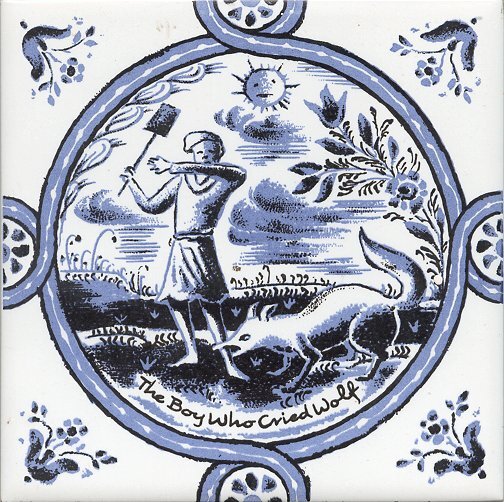 These tiles show lively modern designs inside a circle with a rope border enclosing four smaller circles at the compass points, with pleasant floral patterns in the corners. The wolf in the first tile has his jaws around the crying boy's leg! The ears are lopped over the sleep hare's head in the last tile. Each tile has felt backing, a cut-out hanger, and label suggesting some of the history of tile work. Each label claims that the tiles are hand screened. The TH tile has a separated corner that has been reattached. - Source