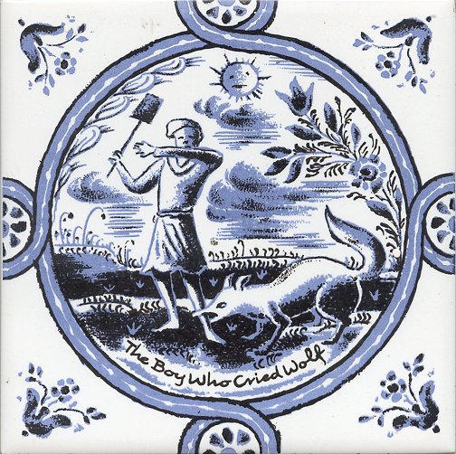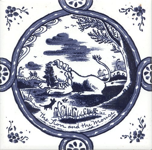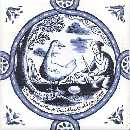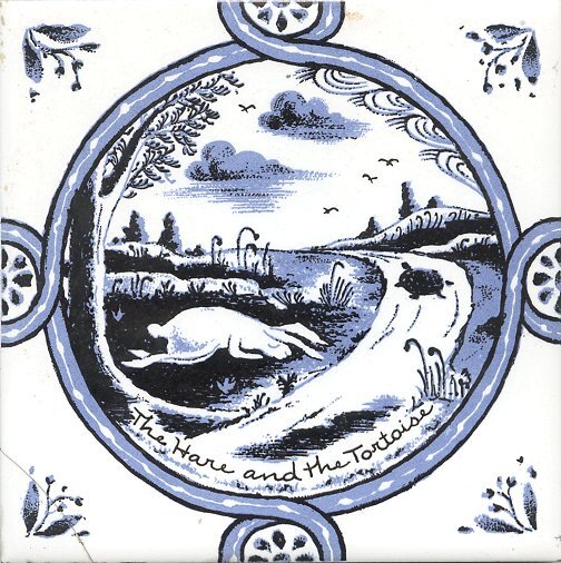 1960? Four tiles, each marked as "Inspired by 18th Century Aesop's Fable Tiles." 6" x 6". Blue-and-white designs of BW, GGE, LM, and TH. Libertyville, IL: Berggren Trayner Corporation. Designs B-70 through B-73. $21 from Kay Hofman, Floodwood, MN, through Ebay, June, '00.