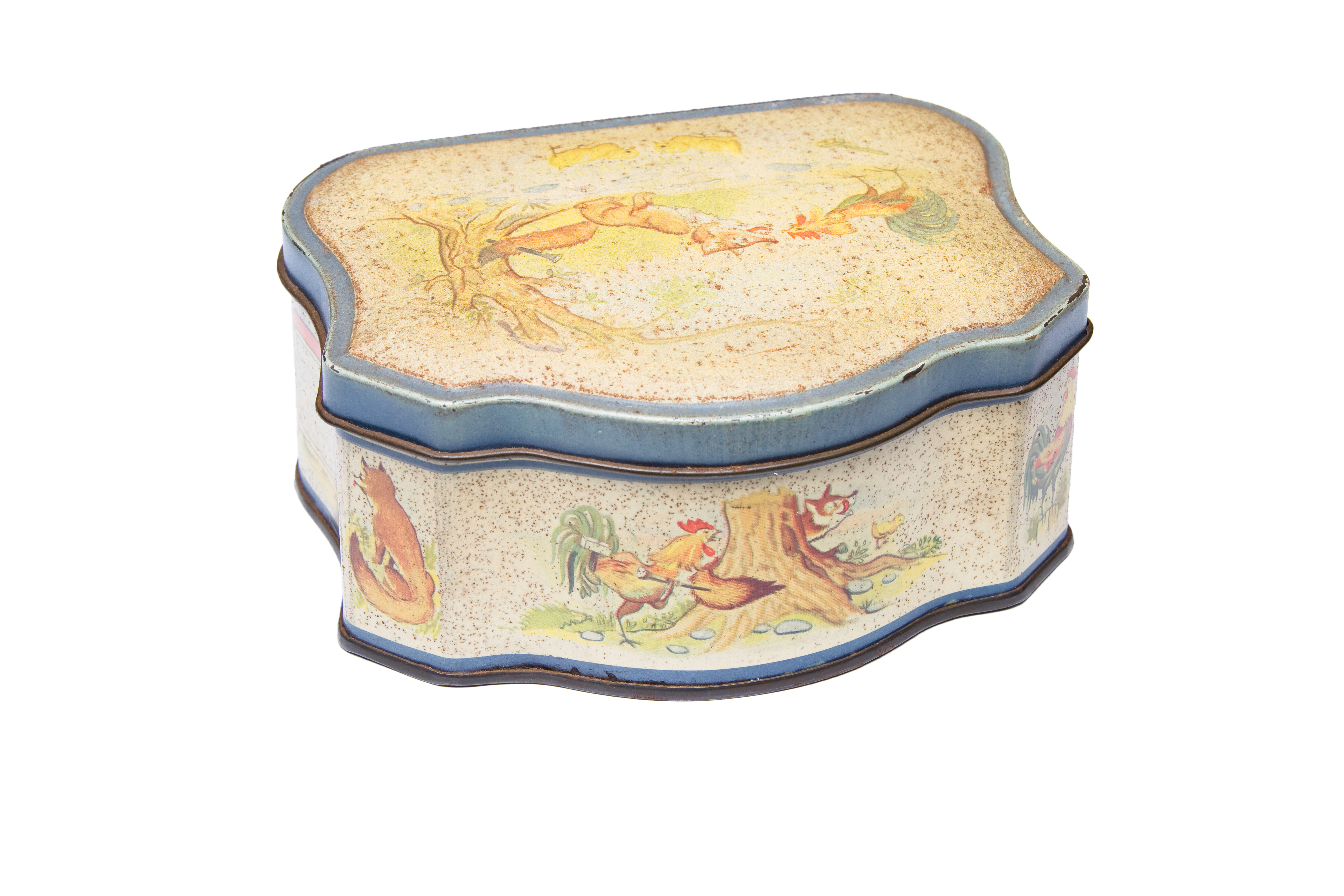 - WG syrup tin, featuring "The Fox and the Rooster." 5¼" x 4" x 2¼" high.