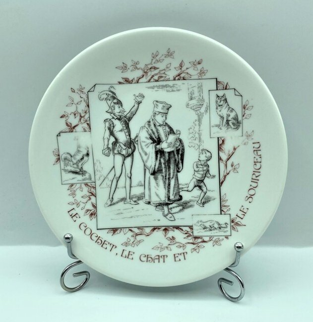 2010? Two-colored plate of Jean de La Fontaine's "Rooster, Cat, and Mouse." 7 3/4" across. Made in France. Paris: Porcelaines Champs-Elysées. $20 from AmericasMainStreet through Etsy, Oct., '23.
