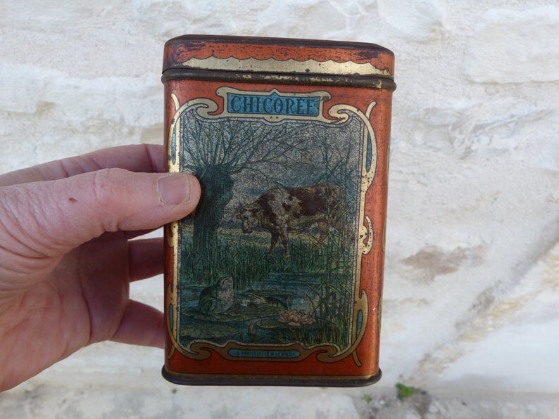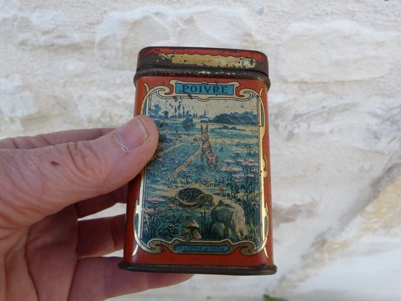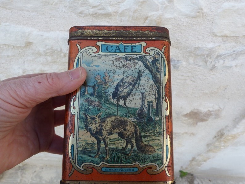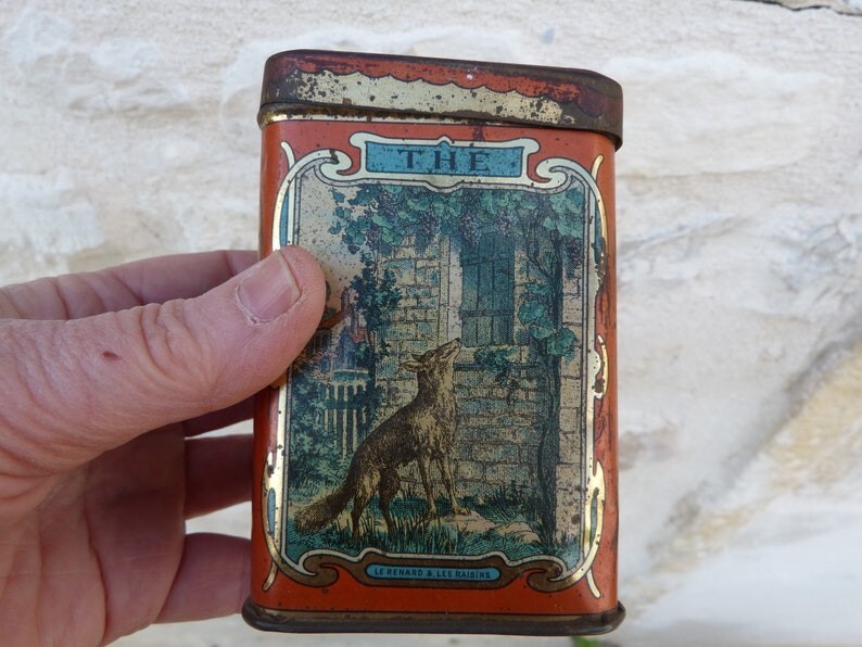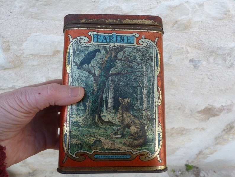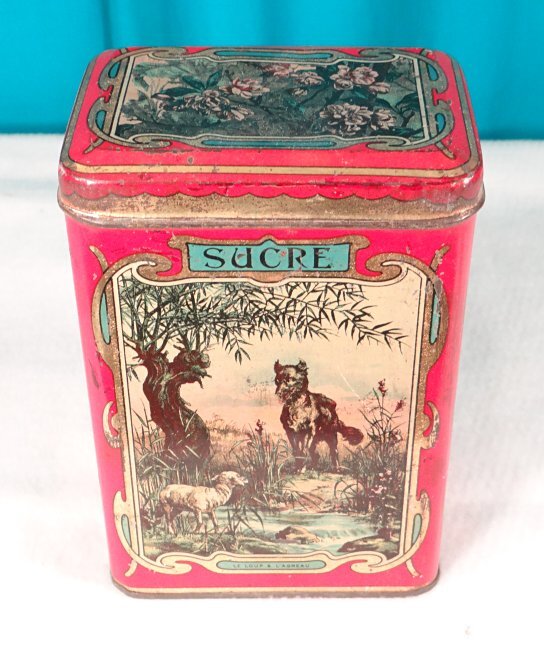 1920? Set of 6 tin canisters displaying lithographs of La Fontaine Fables. Sugar tin for $50 from tincollectors@gmail.com, Jan., '20. The other 5 French tin canisters for $109.75 from petitbrocante through Etsy, Nov., '24.