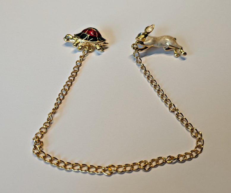 1995? Tortoise and hare pins. Goldtone with two figures connected by a chain, 9 inches long. Hand enameled with genuine Austrian rhinestones for eyes? Unknown source.