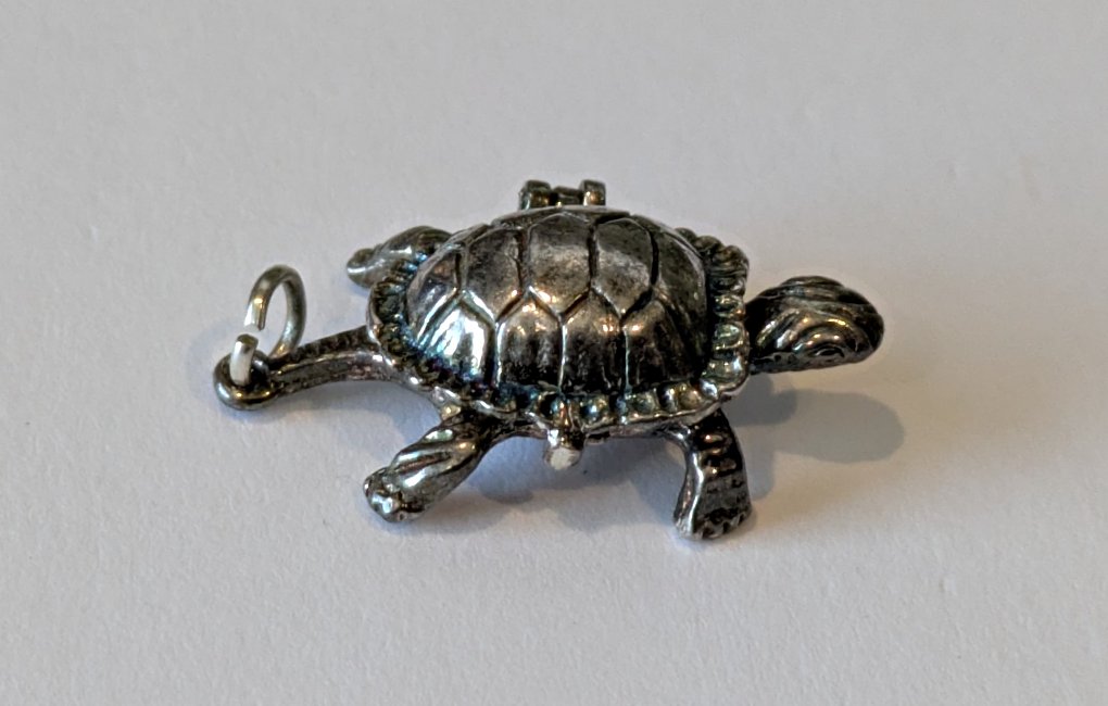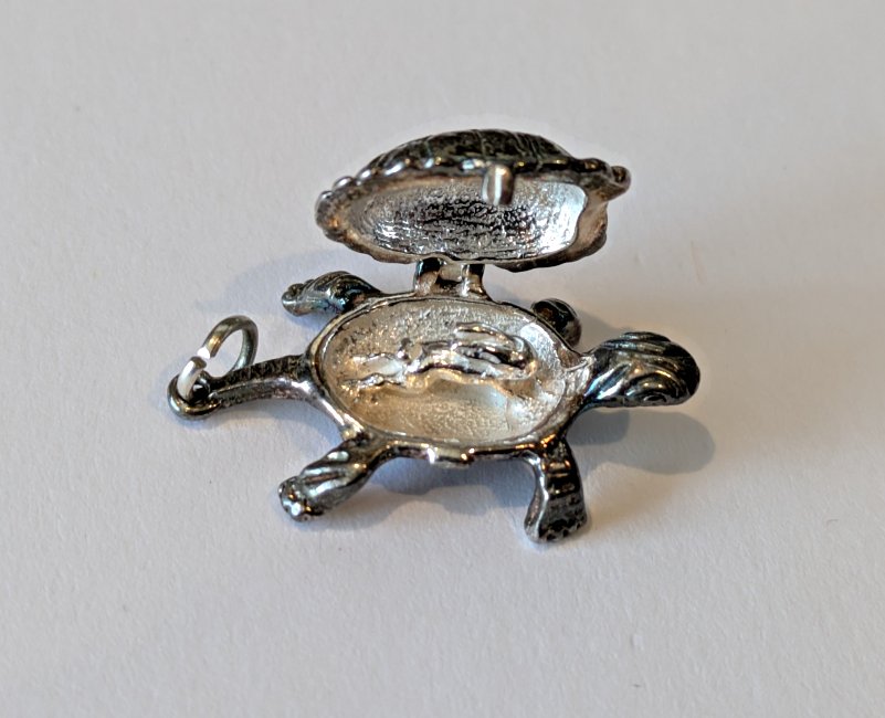 The collection received this charm a long time ago, but we only now are able to catalogue it. As I found it, I wondered why we had a lone tortoise in the collection. Closer examination revealed a hinge, and some patient probing found a way to get it open after so many years of being shut. The smallest rabbit in the world is lodged inside this tortoise! He lives in a lovely pearl-colored casing. - Date