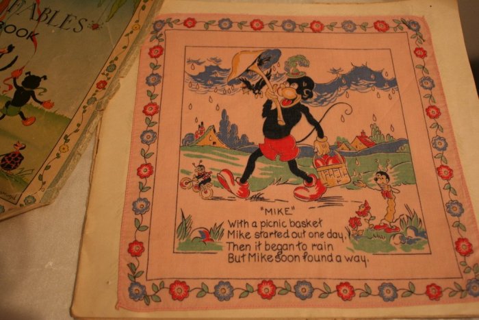 It took twelve years, but this purchase solves a mystery. I had found a copy of this book in 1999 and saw it as a coloring book. "What it has to do with a hankie neither the seller nor I can figure out," I wrote then, adding that it measures slightly larger than 10" x 11" and has seven pages of black-and-white outlines to color in. They were in fact colored in by some youthful hands. Now I find a copy whose spine has given way but whose pictures are uncolored. But this copy contains six of the (probably) eight original handkerchiefs pinned into the booklet! Those missing are "Don Dog" and "Waffles and Countess." Neither copy seems to have a first coloring-page for "Mike," one of the handkerchiefs here. As the seller noted, "the hankies are in great condition and have no distinguishing damage other than some slight color variation/facing and/or creasing due to age." In fact, the handkerchiefs present a fine color version of the coloring book design I admired in that copy. As I mentioned then, the booklet fits with the "Aesop's Fables" pins I have found and with versions of the cartoons associated with this Van Beuren series. Click on a small image below to get a view of the book open to a picture of the "Fables Gang" flying to school on an airplane, of Mike picnicking, or of Countess serving cakes and tea. Click on the book's title above to find the book in the bibliography. - Date