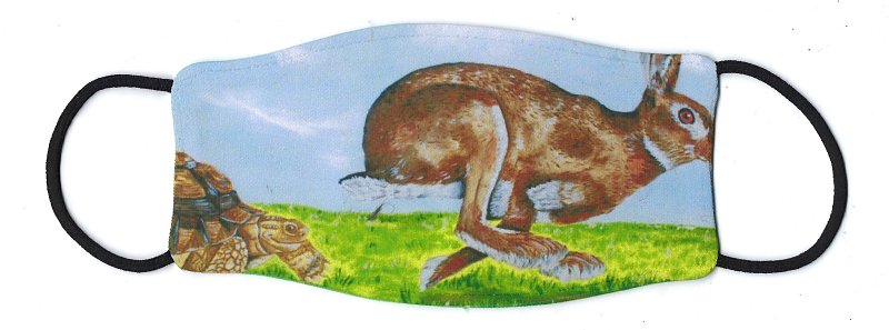 Now, this is fascinating. I checked back when I got the mask. Jenna Catton has translated this vigorous painting into all sorts of things: t-shirts, hoodies, sweatshirts, tanktops, laptop skins, prints, postcards, posters, bath mats, mugs, zipper pouches, greeting cards, and journal covers! I picked “mask” because I thought it was the most surprising. I gather that we are looking at the start of the race. The hare will soon let the tortoise catch up. - Date