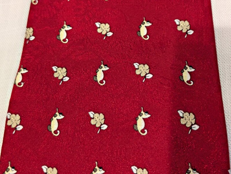 The repetition here is absolute in rather rigid rows. Fox and grapes alternate and then are in the next row in checkerboard alternation. As with other ties, I wonder if there really was an effort to have the viewer take in the specific object presented on the tie. The effect is rather "a red tie with some white markings." In fact, are those grapes or rather leaves? - Date