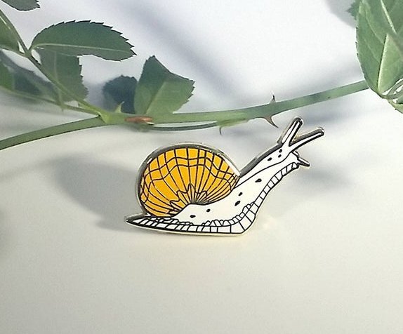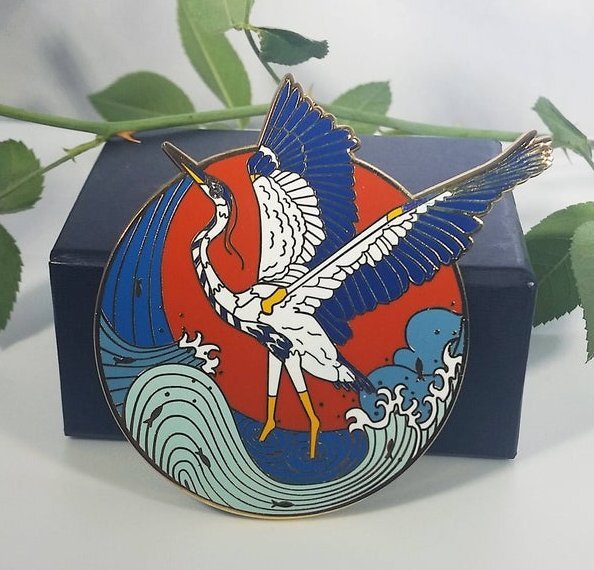 2020 Heron and Snail Hard Enamel Pins. By Artsquach. Heron about 2½” x 2 ½”. $14 from ArtSquatch through Etsy, Dec., ’20. Smaller snail purchased from Artsquatch through Etsy for $8, July, ’21.