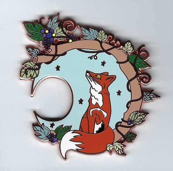 This is a beautiful pin that I missed when I first ordered a heron from ArtSquatch. This fox, like Caxton’s, just looks at the out-of-reach grapes. Lovely work! - Source