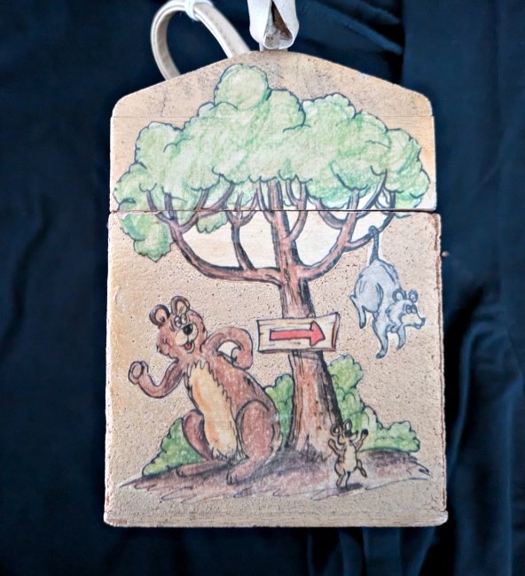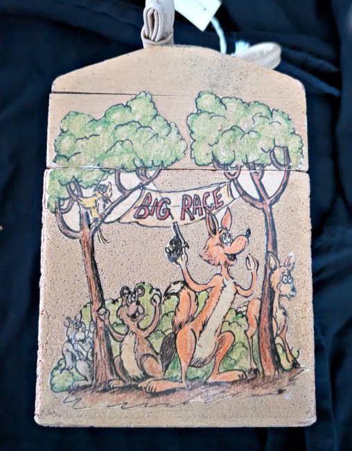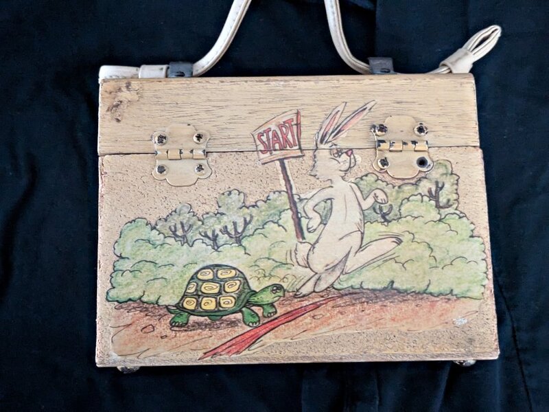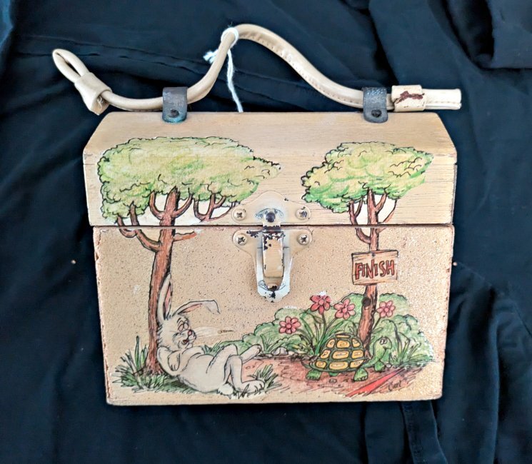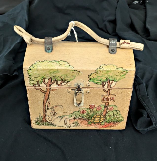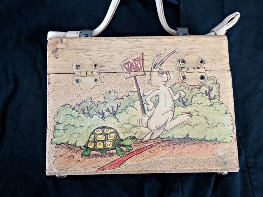 Here is one of the more unusual objects in the collection. I learned what it is only by going online and seeing another instance for sale, with a price of $150 discounted to $75. I had wondered whether it might be a lunchbox. The four sides track the race from the starter's line to the finish, where the hare is sleeping five feet from the finish! The pictures seem to be carefully applied decals. The artist signs the last image "Carl." I wondered if the images themselves might be found on the web, but there I had no luck. I ask myself what the occasion might be for carrying a TH purse. - Date