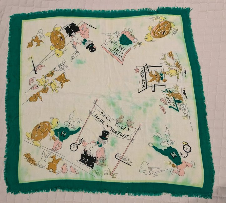 This lively scarf asks to be viewed from several different angles, from the race's start to its finish. The hare runs with a stopwatch in his hand. He also stops at a hot dog stand. A grandstand full of tortoises and hares watches the tortoise cross the line as winner. Browns, yellows, and pinks. - Date