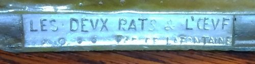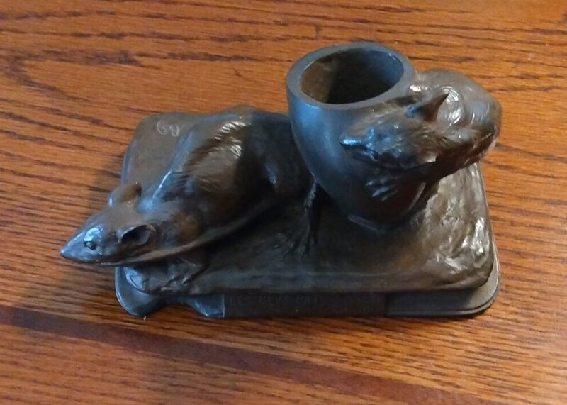 This is a very heavy desktop accessory. The inkwell is shaped like the lower two-thirds of an egg, and so it fits very well with La Fontaine's charming fable about the collaborative effort of two rats to bring an egg to their nest. According to La Fontaine's fable, one got himself under the egg, and the other pulled him by the tail. Together they got the job done! Here carrier rat is not as in most interpretations, I believe, under the egg but rather beside it. I have found the object on the web. Christie's, presumably for the original, auctioned it for $863. Drouout is offering a piece clearly labeled as "After Antonin Aigon." Which kind do we have? That question lies behind my question mark concerning the original date of this item. - Date