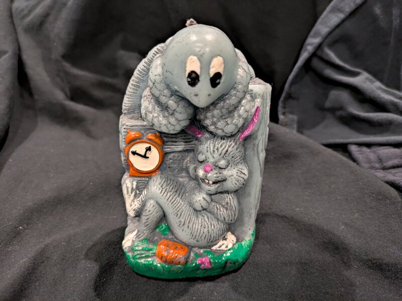 This candle is still readily available online. The candle-makers use the tortoise's shell as backing for the candle. The tortoise looks down with paws at his ears in wonder over the sleeping hare. The hare, who has eaten half of a carrot, sleeps on. Is it a sense of humor that fills out space with an alarm clock? - Date