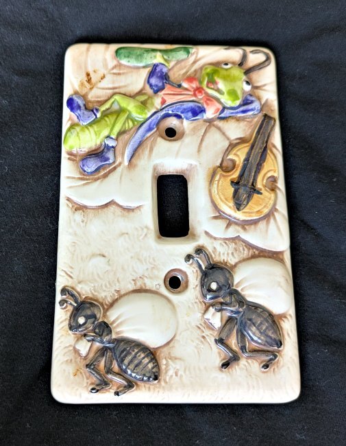 Simple designs allow for the three holes necessary for these switch-covering plates. The racers' path leads to the red flat at the top of the switch. Is that colorfully clad grasshopper eating a cucumber while the black ants trudge along with their sacks? - Date